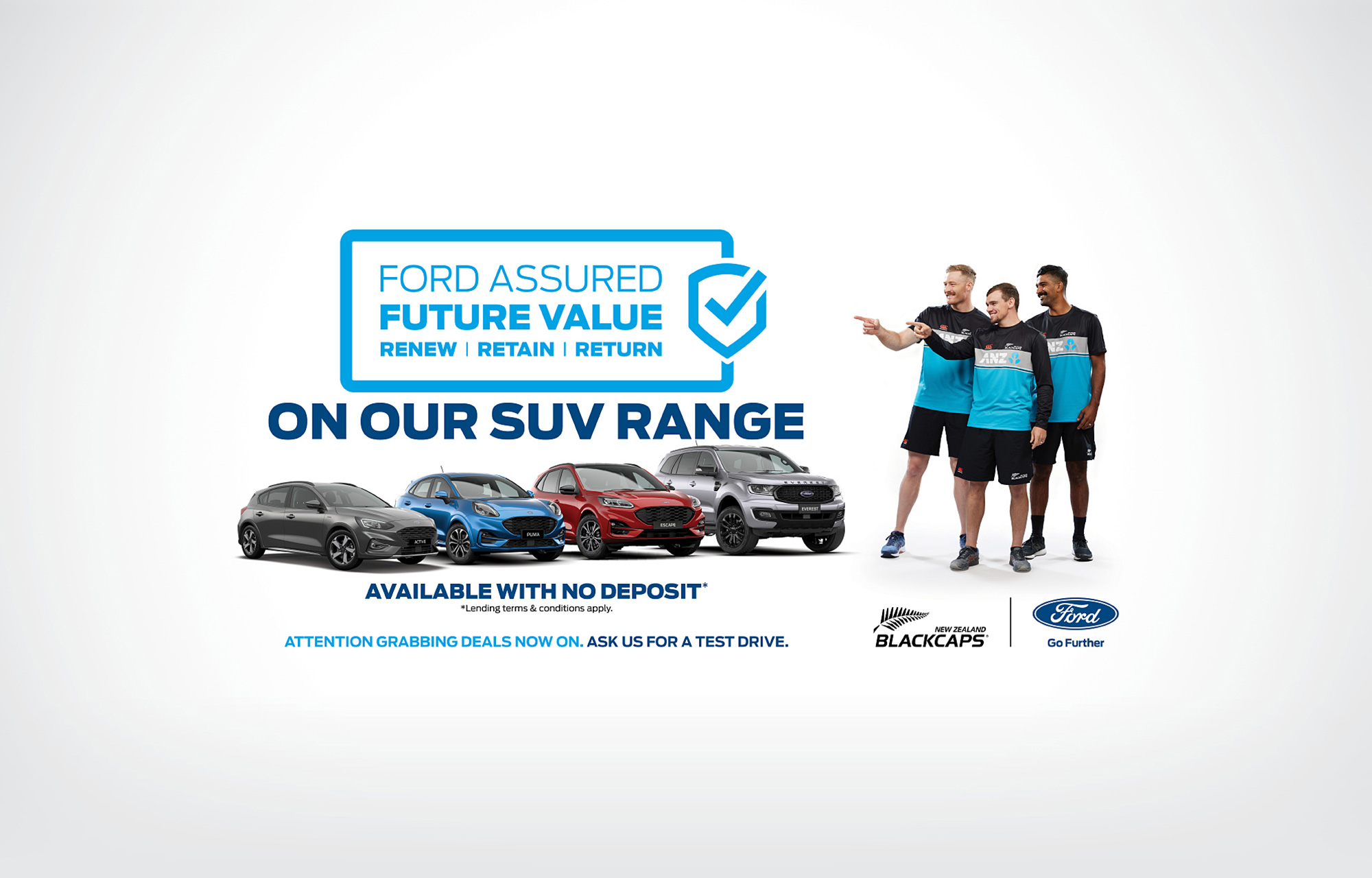 This Ford Assured Future Value offer is valid from 01 January 2021 to 31 March 2021 (or while stocks last at participating Ford New Zealand dealerships only). Ford Assured Future Value is available on selected vehicles only through My Ford Finance. Repayments for loans with a Ford Assured Future Value agreement will be as shown in the Ford Assured Future Value table [on www.ford.co.nz/shopping/ford-assured-future-value ] and are based on the relevant 2020 Ford SUV Range models, its Recommended Retail Price, the kilometre allowance under the relevant Ford Assured Future Value agreement, the applicable fixed interest rate, the loan term, and the amount of deposit (if applicable). The total amount payable over the term of the loan for each model is also shown in the table and all interest rates shown are fixed for the term of the loan. On-road costs, a $105 UDC establishment fee, $10.35 PPSR fee and Dealer Origination Fee each apply where a Ford vehicle is financed through My Ford Finance. Check with your local Dealer for details of their fee. My Ford Finance is only available through UDC Finance Limited. UDC Finance standard terms, conditions, lending and credit criteria apply to any UDC loan. UDC Finance Assured Future Value terms and conditions apply to any Ford Assured Future Value contract. If these conditions are not met, the option to return the vehicle for the assured future value at the end of your loan term may not be available, and the outstanding loan must still be repaid in full.